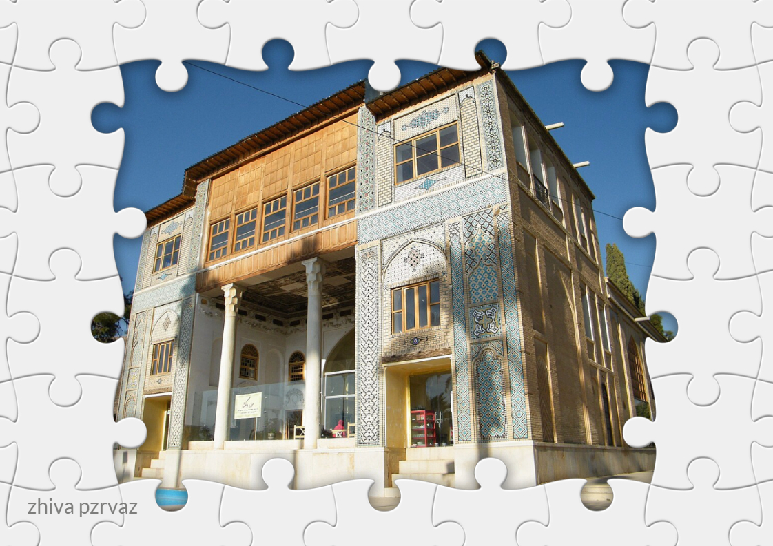 The mansion contains a main hall, four royal chambers (shāh-neshin), and a large balcony supported by two columns overlooking the garden’s main pool