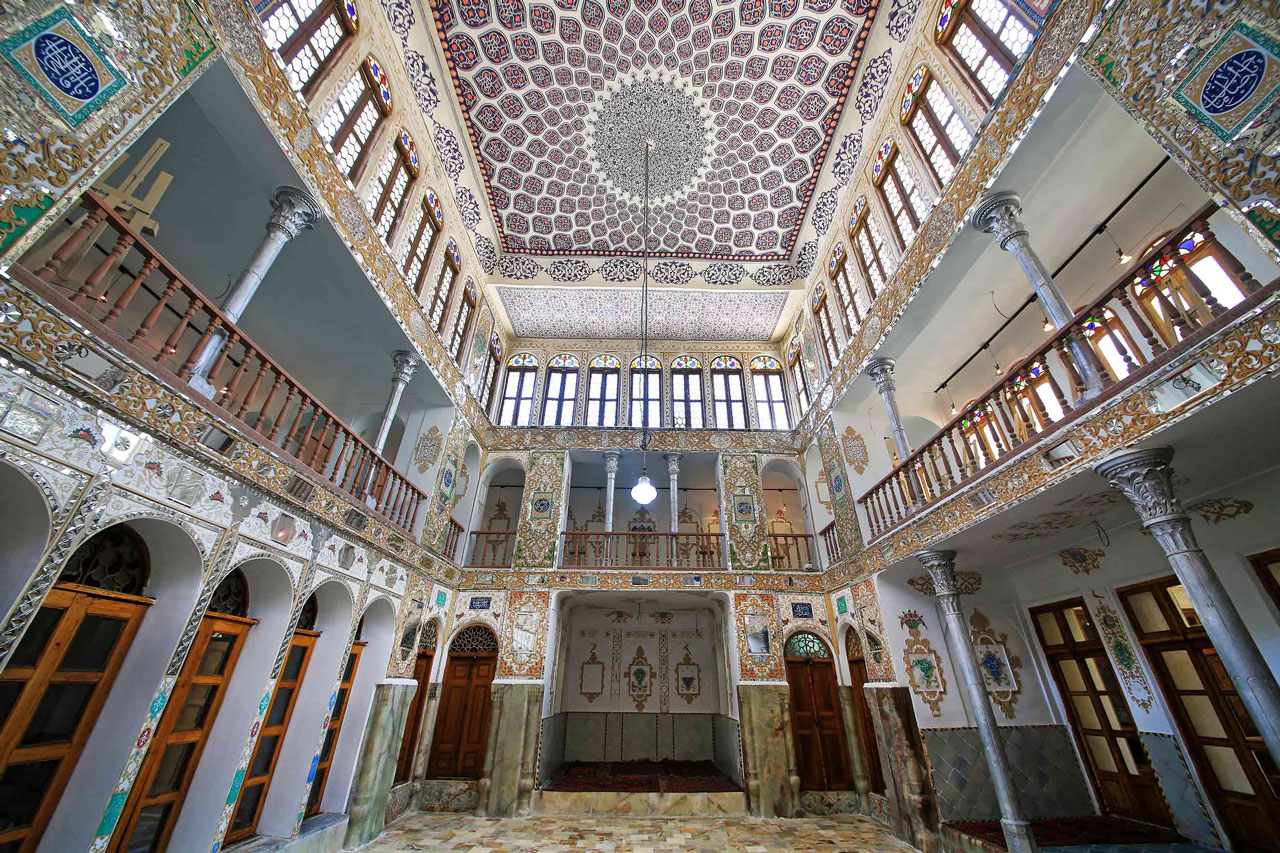 • - وجود ارسی چهار لنگه دو جداره با نقوش اسلیمی که میانه آن با ورق طلا پوشانده شده، جهت مصونیت حرمسرای خانه.